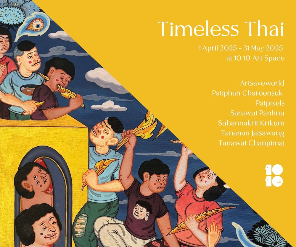 ตั้งแต่วันที่ 1 เมษายนนี้ 10 10 Art Space ของโรงแรมจะเปิดบ้านต้อนรับ “Timeless Thai” นิทรรศการกลุ่มที่ตีความงามศิลปะไทยดั้งเดิมผ่านมุมมองร่วมสมัย ด้วยผลงานจากศิลปินรุ่นใหม่ 7 ท่าน ที่แต่ละคนต่างมีวิธีเล่าเรื่องความเป็นไทยในแบบของตัวเอง ซึ่ง Artsaveworld นำเสนอไทยป๊อปอาร์ตที่โดดเด่น ผสมผสานรากวัฒนธรรมเข้ากับกลิ่นอายโมเดิร์น, Patiphan Charoensuk ถ่ายทอดแรงบันดาลใจจากหน้าประวัติศาสตร์ไทยผ่านชิ้นงานทรงพลัง, Patpixels สาดสีพิกเซลล์สไตล์ยุค 90s ลงบนฉากชีวิตไทยแบบสตรีต, Sarawut Panhnu จับคู่จิตรกรรมฝาผนังแบบพุทธศิลป์เข้ากับวัฒนธรรมป๊อป, Subannakrit Krikum รังสรรค์จิตรกรรมไทยประณีตบนแผ่นไม้สัก, Tananan Jaisawang ศิลปิน mixed media ที่หยิบแรงบันดาลใจจากวัดอรุณฯ มาปรุงรสใหม่ และ Tanawat Chanpimai ตีความภาพไทยดั้งเดิมในมุมใหม่ด้วยส่วนผสมระหว่างความสมจริงกับจินตนาการ นิทรรศการนี้ไม่เพียงสะท้อนความเป็นไทยในรูปแบบที่คุ้นตา แต่ชวนให้มองเห็นความร่วมสมัยที่แทรกอยู่ในทุกลายเส้นและสีสัน
