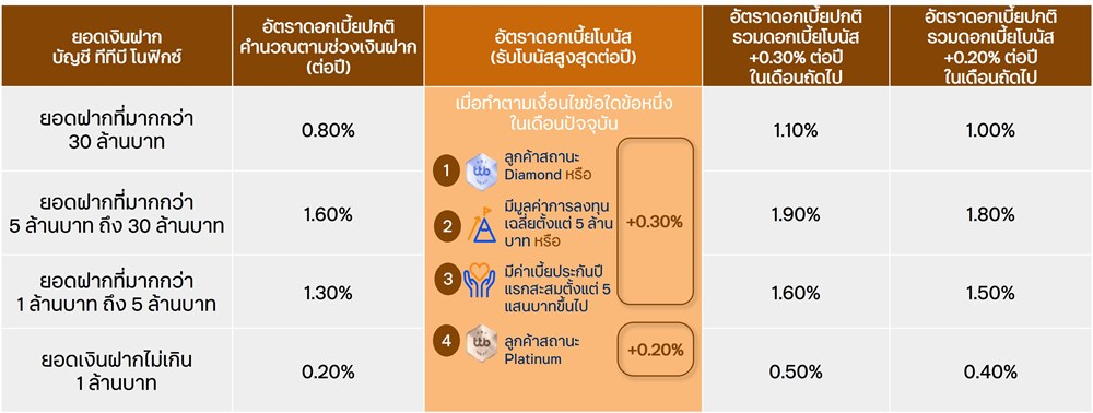 *อัตราดอกเบี้ยปกติรวมกับดอกเบี้ยโบนัสสูงสุด เมื่อเข้าเงื่อนไขอย่างใดอย่างหนึ่งตามที่ธนาคารกำหนด รับอัตราดอกเบี้ยโบนัสพิเศษเพิ่ม 0.30% เพียงมีค่าเบี้ยประกันปีแรกครบ 5 แสนบาท ต่อปี หรือมียอดเงินลงทุนในกองทุนรวมเฉลี่ย 5 ล้านบาทขึ้นไป หรือมีสถานะ Diamond | หรือรับอัตราดอกเบี้ยโบนัสพิเศษเพิ่ม 0.20% สำหรับสถานะ Platinum โดยสามารถตรวจสอบสถานะได้ง่ายๆ ที่เมนูสิทธิประโยชน์ของฉัน ผ่านแอป ttb touch