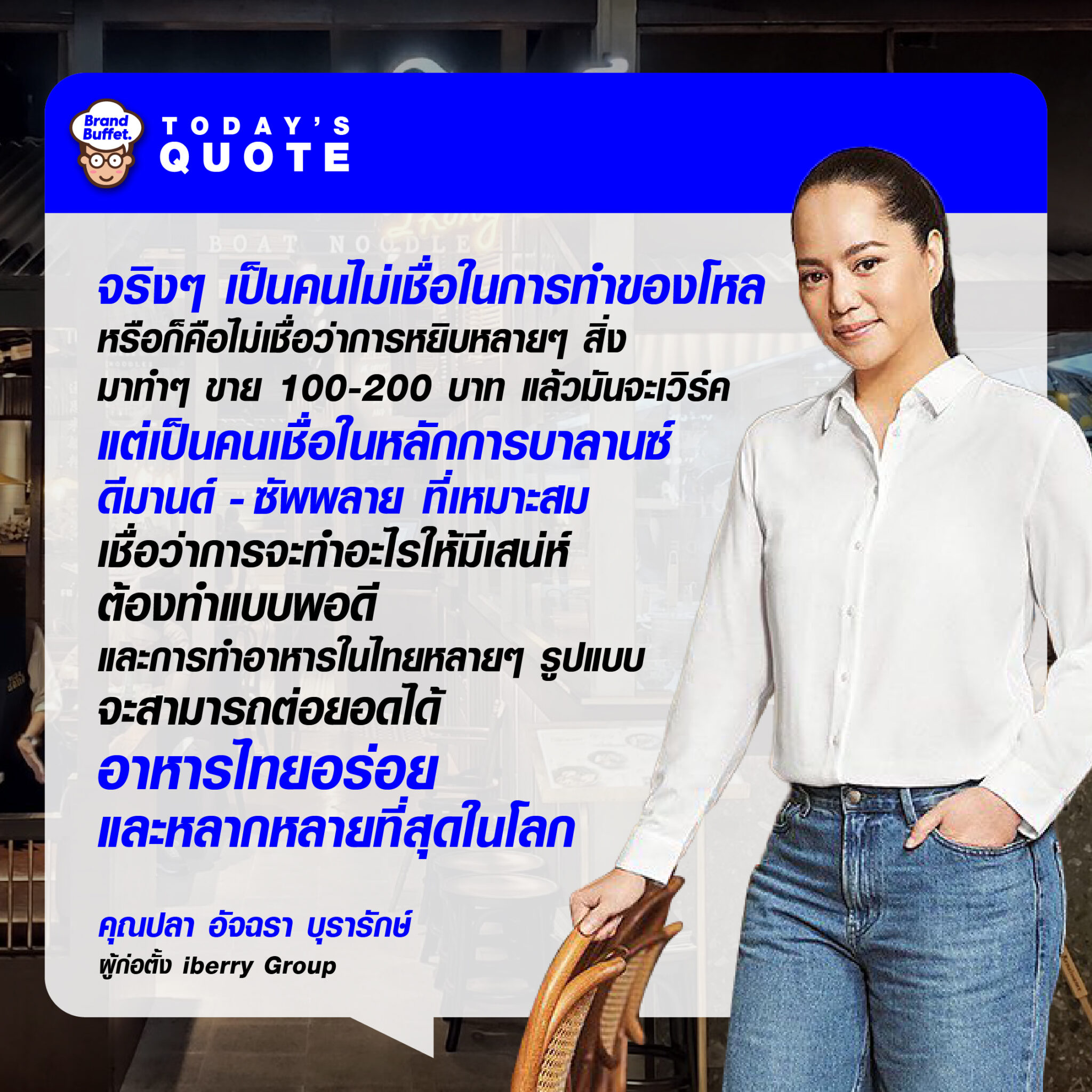 ถ้าพูดถึงบุคคลที่ประสบความสำเร็จมากที่สุดในแวดวงร้านอาหารเมืองไทย ชื่อของ “คุณปลา iberry” หรือ “คุณปลา-อัจฉรา บุรารักษ์’ Founder & Creative Director, iberry Group คงเป็นหนึ่งในชื่อที่ใครหลายคนนึกถึง เพราะไม่ว่าจะหยิบจับทำแบรนดคาว-หวานอะไร ก็ล้วนแต่ประสบความสำเร็จทั้งสิ้น