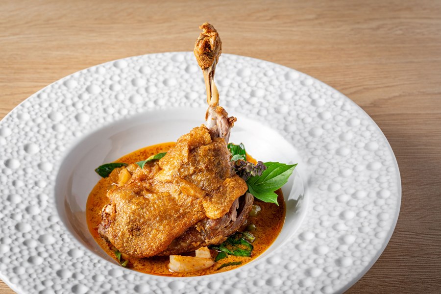 ตามด้วยเมนูเด่นอย่าง “แกงเผ็ดขาเป็ดกรอบ” เนื้อขาเป็ดกรอบนอกนุ่มในมากับแกงกะทิรสจัดจ้าน เสิร์ฟพร้อมข้าวสวยหอมมะลิหอมกรุ่นกำลังดี ปิดท้ายมื้ออาหารด้วยของหวานเกินห้ามใจอย่างเมนู “ดอกมะลิ หยกมณี” พานาคอตต้ารสเลิศกลิ่นมะลิ เสิร์ฟพร้อมสาคูใบเตยและน้ำกระสาย ด้วยองค์ประกอบจากขนมหวานไทยแบบดั้งเดิม ที่ถูกรังสรรค์ขึ้นมาใหม่ได้อย่างแยบยล