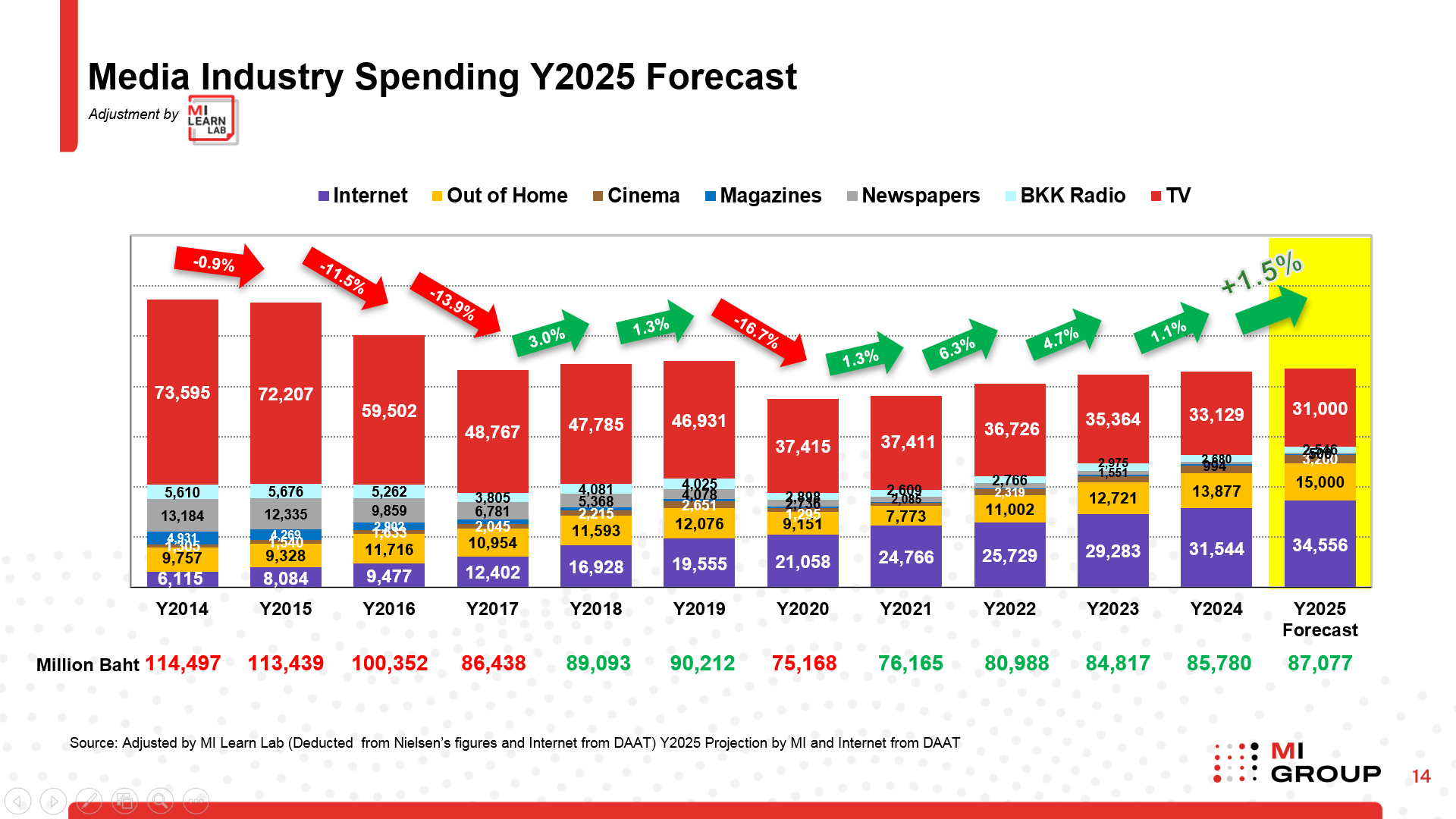 โดยสรุป MI GROUP คาดการณ์แนวโน้มอุตสาหกรรมโฆษณาและสื่อสารตลาดตลอดปี 2025 อยู่ในภาวะ “โตแต่แผ่ว” ที่ 1.5% มูลค่ารวม 87,077 ล้านบาท เป็นตัวเลขเติบโตที่ปรับลดจากคาดการณ์ช่วงต้นปีที่ 2.2%