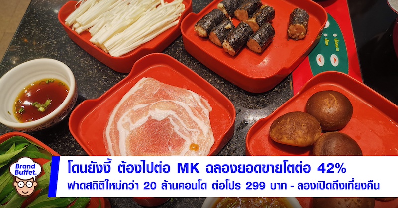 โดยเฉพาะพี่ใหญ่ตลาดหม้อต้มอย่าง MK Restaurants หลังประกาศจัดโปรโมชันเอาใจชาวหม้อต้มกับโปรโมชั่นบุฟเฟต์ 299 บาท ที่สาขาในโลตัส บิ๊กซี และสาขาที่ร่วมรายการ เมื่อ 9 – 30 มิถุนายนที่ผ่านมา จนสามารถสร้างปรากฏการณ์บุฟเฟต์ 299 บาท สร้างสถิติใหม่กว่า 20 ล้านคอนโด ดันยอดขายโตกว่า 42% เพียง 22 วัน และลูกค้าสมาชิก MK กลับมาใช้บริการมากกว่าปกติถึง 100%