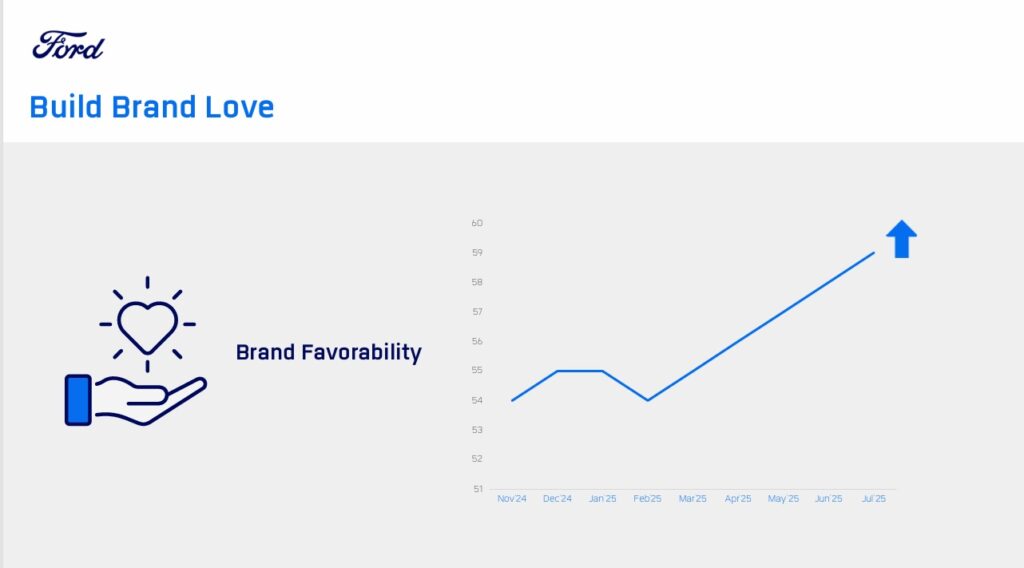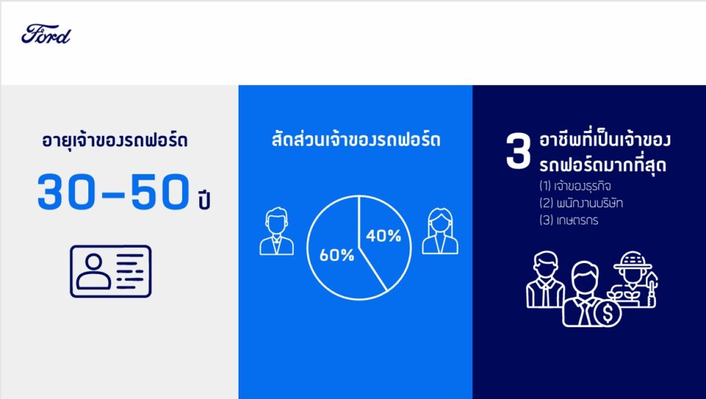 ในขณะเดียวกัน Brand Love ยังดีขึ้นด้วย ยืนยันได้ด้วยตัวเลขการสำรวจความชื่นชอบแบรนด์จากเดือน พ.ย.2567 อยู่ที่ 54% เพิ่มเป็น 59% ในเดือน ก.ค. 2568 ส่งผลให้ Brand Perception การเป็นแบรนด์ Build Tough ของฟอร์ดที่เน้นเรื่องสมรรถนะคุ้มค่ามีตัวตนชัดเจนและแข็งแกร่งขึ้น โดยปัจจุบันลูกค้าหลักของฟอร์ดคือ กลุ่มคนอายุ 30-50 ปี สัดส่วนประมาณ55% รองลงมาคือ Gen Z อายุ 20-30 ปี มีสัดส่วนประมาณ 17-20% โดย 5 จังหวัดที่ฟอร์ดมียอดขายสูงสุดคือ กรุงเทพฯ, ชลบุรี, เชียงใหม่, ภูเก็ต และขอนแก่น
