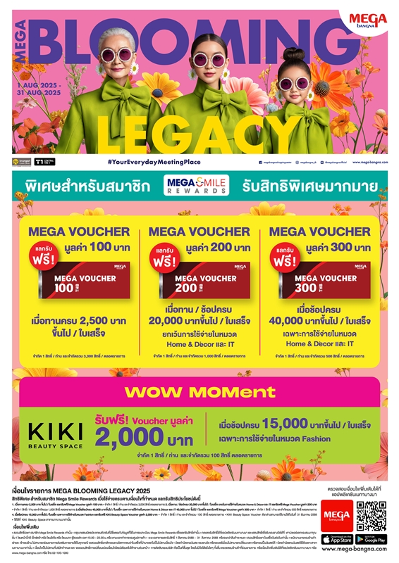 ตลอดเดือนสิงหาคมนี้ ขอชวนคุณมาใช้ช่วงเวลาที่มีค่า ร่วมสร้างความทรงจำแสนพิเศษกับคุณแม่และคนที่คุณรักที่ศูนย์การค้าเมกาบางนา ในแคมเปญ “MEGA BLOOMING LEGACY” ระหว่างวันที่ 1 – 31 ส.ค. 68 ที่จัดเต็มทั้งสิทธิพิเศษ กิจกรรม และของรางวัลมากมาย ท่ามกลางบรรยากาศแห่งความรัก ความอบอุ่น และความสุขที่รอให้ทุกเจเนอเรชันมาร่วมแบ่งปันช่วงเวลาแสนพิเศษนี้ร่วมกัน