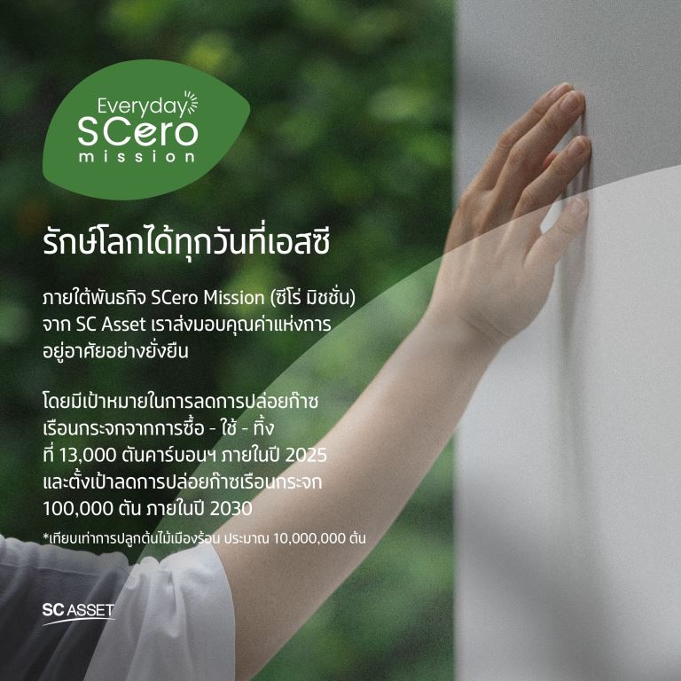 บริษัท เอสซี แอสเสท คอร์ปอเรชั่น จำกัด (มหาชน) หรือ SC Asset ในฐานะผู้นำอสังหาริมทรัพย์คุณภาพสูง และมีนวัตกรรม ได้แสดงวิสัยทัศน์ระยะยาวอย่างชัดเจนผ่านการสานต่อพันธกิจ “SCeroMission” โดยร่วมมือกับพันธมิตรทางธุรกิจและคู่ค้ากว่า 100 ราย ผ่านการออกแบบอาคารและการใช้วัสดุรักษ์โลก สะท้อนความมุ่งมั่นในการลดการปล่อยก๊าซเรือนกระจก (GHG) อย่างจริงจังและเป็นรูปธรรม ล่าสุด SC Asset ได้เปิดตัวแคมเปญใหม่ “Everyday SCeroMission” ภายใต้แนวคิด “ภารกิจรักษ์โลกในทุกตารางนิ้วของการอยู่อาศัย”