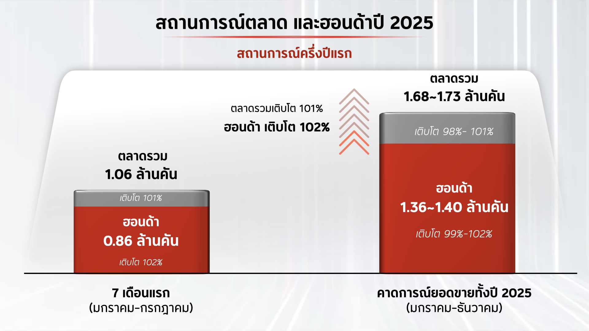 สำหรับตลาดรวมตลอดปี 2568 เราคาดการณ์เหมือนตอนต้นปีว่าจะมียอดขายรวมอยู่ที่ 1.68 ถึง 1.73 ล้านคัน หรือ เติบโตประมาณ 101% ส่วนไทยฮอนด้าตั้งเป้ายอดขายไว้ที่ 1.36 ถึง 1.40 ล้านคัน หรือราว 102% เมื่อเทียบกับปีก่อน ซึ่งสะท้อนถึงความเชื่อมั่นของผู้บริโภคที่มีต่อผลิตภัณฑ์และบริการของฮอนด้าอย่างต่อเนื่อง”