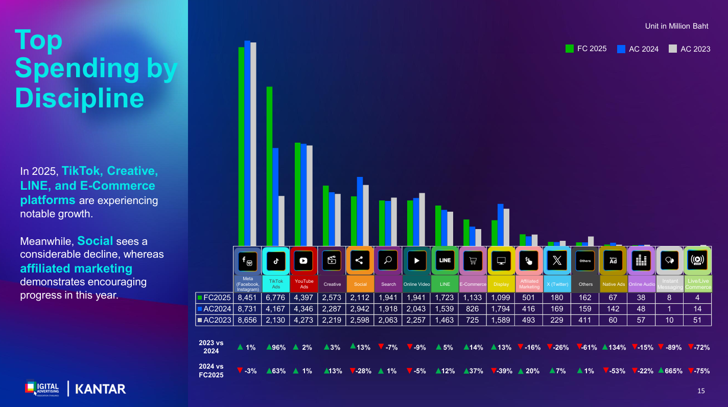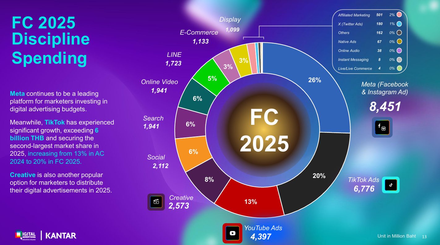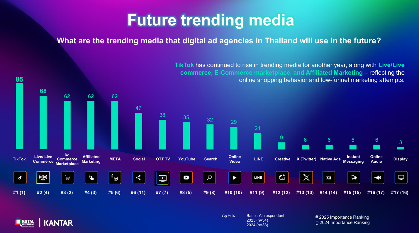 โฆษณา TikTok ปีนี้เติบโตสูงถึง 63% ขึ้นมาครองอันดับ 2 (จากปีก่อนอยู่อันดับ 3) แทน YouTube นอกจากนี้สื่อดิจิทัลที่เติบโตสูง E-Commerce เติบโต 37% Affiliate Marketing เติบโต 20%