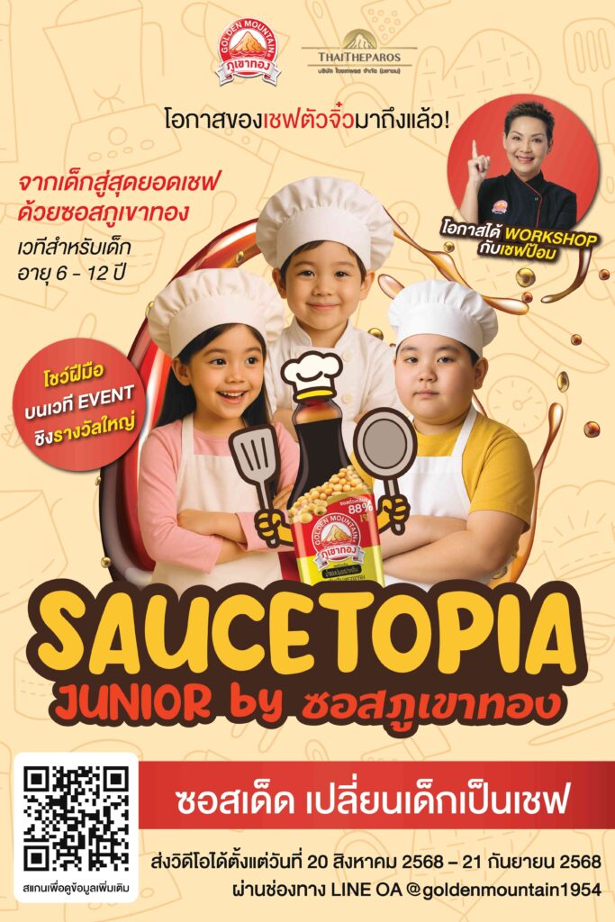 ใครจะเป็นสุดยอดเชฟตัวจิ๋วคนแรกในดินแดน SauceTopia แห่งนี้ มาร่วมเปลี่ยนจินตนาการให้เป็นเมนูแสนอร่อยกับซอสภูเขาทองฝาเหลือง ตัวช่วยให้เด็กๆ สนุกกับการทำอาหาร รับสมัครแล้วตั้งแต่วันนี้ – 21 กันยายน 2568 สนใจติดตามรายละเอียดเพิ่มเติมได้ที่ Facebook : ซอสภูเขาทอง by Thaitheparos