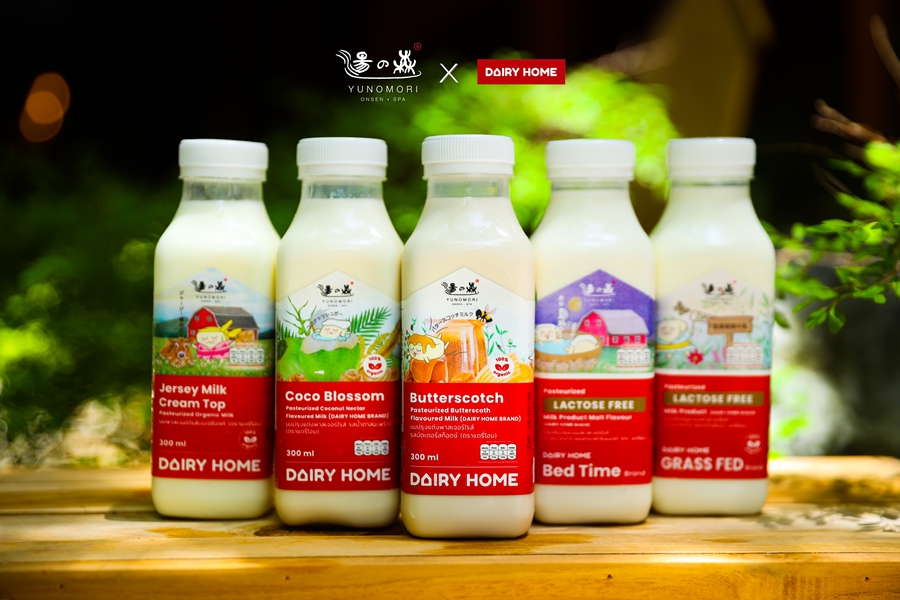 ขอเชิญสัมผัสนม 5 รสชาติยอดนิยมของ Dairy Home ได้แก่ Bed Time, Grass Fed, Butterscotch, Coco Blossom, และ Jersey Milk Cream Top ในบรรจุภัณฑ์ดีไซน์พิเศษเฉพาะสำหรับ Yunomori Onsen & Spa ประดับด้วยมาสคอตสุดน่ารักอย่าง Yutofu-chan