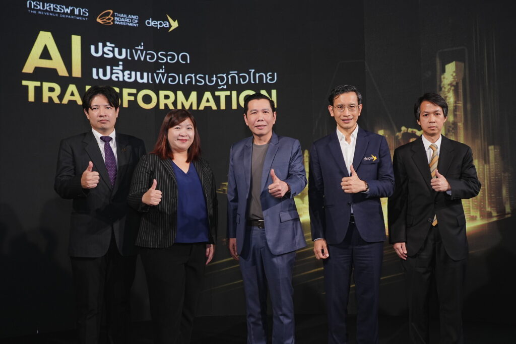 ผศ.ดร.ณัฐพล นิมมานพัชรินทร์ ผู้อำนวยการใหญ่ สำนักงานส่งเสริมเศรษฐกิจดิจิทัล หรือ ดีป้า พร้อมด้วย นายนเรศ บูรณากาญจน์ นักวิชาการภาษีชำนาญการพิเศษ กรมสรรพากร และ นายธนชาต ลาภพานิช นักวิชาการส่งเสริมการลงทุน ระดับชำนาญการพิเศษ สำนักงานคณะกรรมการส่งเสริมการลงทุน (บีโอไอ) ร่วมประกาศนโยบายสำคัญ AI Transformation: ปรับเพื่อรอด เปลี่ยนเพื่อเศรษฐกิจไทย โดยมีคณะผู้บริหารและผู้แทนจากหน่วยงานต่าง ๆ ร่วมงานโดยพร้อมเพรียง ณ อาคาร ดีป้า (สำนักงานใหญ่) ซอยลาดพร้าว