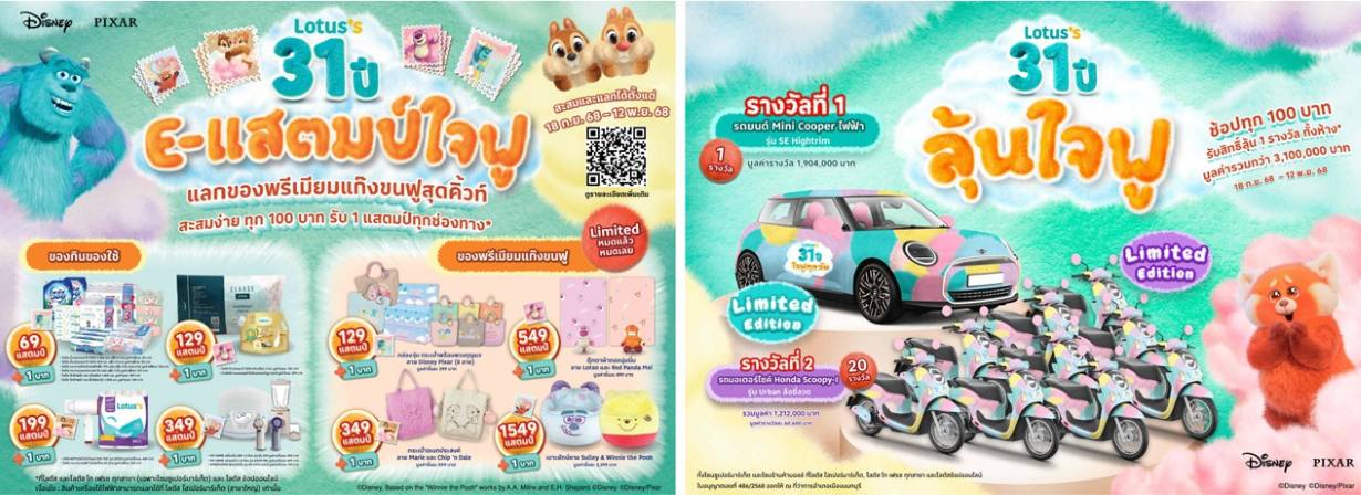 นอกเหนือจากโปรโมชันพิเศษและของพรีเมียมสุดน่ารัก ลูกค้ายังสามารถเป็นเจ้าของสินค้าลิขสิทธิ์ลวดลายดิสนีย์สุดเอ็กซ์คลูซีฟ ที่มีวางจำหน่ายเฉพาะที่โลตัสเท่านั้น โดยในคอลเลกชั่นพิเศษนี้ประกอบด้วยสินค้ากว่า 80 รายการ ที่รังสรรค์ขึ้นภายใต้การเฉลิมฉลองครบรอบ 31 ปี พร้อมให้ลูกค้าทุกเจเนอเรชั่นเลือกจับจองได้ตั้งแต่วันที่ 18 กันยายน ถึง 12 พฤศจิกายน 2568
