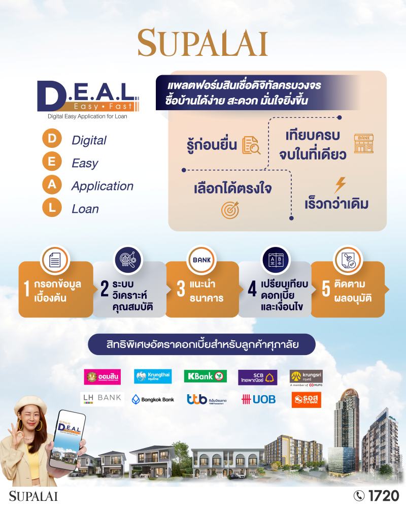 สำหรับแพลตฟอร์ม D.E.A.L. ของศุภาลัย เริ่มใช้งานจริงตั้งแต่เดือนมิถุนายน 2568 ครอบคลุมทุกโครงการทั่วประเทศ และได้รับการตอบรับอย่างดีจากลูกค้า โดยแพลตฟอร์มนี้มอบประสบการณ์ใหม่ที่แตกต่าง ด้วยจุดเด่นในการวิเคราะห์คุณสมบัติลูกค้าล่วงหน้า แนะนำสถาบันการเงินที่เหมาะสม เปรียบเทียบอัตราดอกเบี้ยและเงื่อนไขสินเชื่อที่ตอบโจทย์ พร้อมติดตามผลอนุมัติ ช่วยให้กระบวนการยื่นขอสินเชื่อบ้านและคอนโดมิเนียมของลูกค้าเป็นไปอย่างสะดวก รวดเร็ว ปลอดภัย และมั่นใจได้ในทุกขั้นตอน