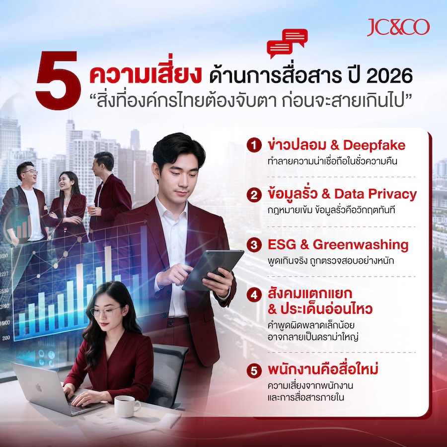 เจซีแอนด์โค คอมมิวนิเคชั่นส์ ที่ปรึกษาด้านการสื่อสารและประชาสัมพันธ์ชั้นนำของประเทศไทย เผยผลการวิเคราะห์ “Thailand Crisis Risk Landscape 2025” ระบุ 5 ความเสี่ยงใหม่ด้านการสื่อสารที่ภาคธุรกิจไทยต้องเผชิญ ตั้งแต่ Deepfake, Data Privacy, ไปจนถึงแรงกดดันด้าน ESG และเสียงสะท้อนจากพนักงาน โดยทั้งหมดเป็นปัจจัยที่สามารถสร้างวิกฤตชื่อเสียงได้ในชั่วข้ามคืน