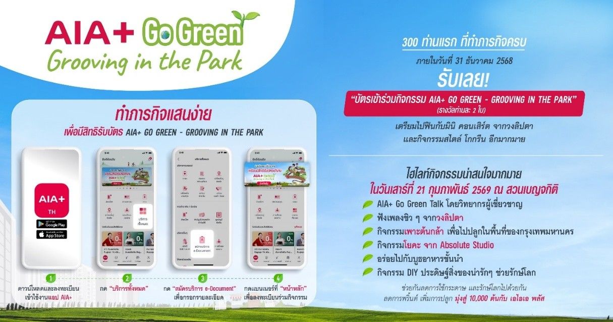 ทั้งนี้ เอไอเอ เตรียมจัดงาน AIA+ Go Green Festival – Grooving in the Park ในวันที่ 21 กุมภาพันธ์ 2569 ณ สวนเบญจกิติ ร่วมกับ กรุงเทพมหานคร และพันธมิตร อาทิ EEC, Layers of emotions, Aura, Absolute Boutique Fitness Studio, FORM Recovery, Yolo, McDonald’s, สมิติเวช และอื่น ๆ โดยในงานจะมีกิจกรรมมากมายที่จะมอบประสบการณ์ ความสนุกสนานควบคู่กับการเรียนรู้เรื่องความยั่งยืน ผ่านคอนเสิร์ตจากวงลิปตา กิจกรรมเวิร์กชอป การจัดการขยะ และการเดินทางที่ลดการปล่อยคาร์บอน ซึ่งนับเป็นงการผนวกความบันเทิงและสร้างการมีส่วนร่วมด้านสิ่งแวดล้อมเข้าด้วยกันอย่างลงตัว