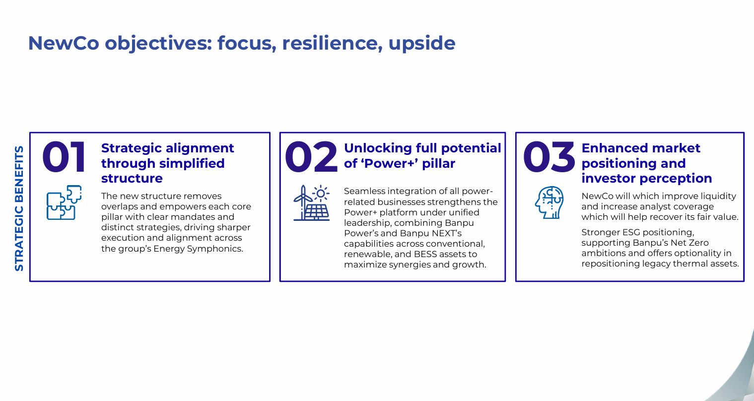 “การปรับโครงสร้างครั้งนี้เป็นสร้างเครื่องยนต์การเติบโตใหม่ให้ BANPU เพื่อให้ BANPU เป็นมากกว่า Holding Company ที่สร้างประโยชน์ให้กับผู้ถือหุ้น BANPU และ BPP ในการเป็นผู้ผลิตพลังงานตั้งแต่ต้นน้ำถึงปลายน้ำ”