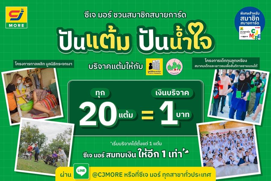 ร่วมเปลี่ยนแต้มเล็ก ๆ ให้เป็นพลังยิ่งใหญ่ “ปันแต้ม ปันน้ำใจ” กับซีเจ มอร์ ได้ตั้งแต่วันที่ 1 พฤศจิกายน ถึง 31 ธันวาคม 2568 เพราะทุกแต้มของคุณ คือโอกาสของใครอีกหลายคนที่จะได้เริ่มต้นใหม่ อย่างมีความหวังในสังคมที่ไม่ทิ้งใครไว้ข้างหลัง