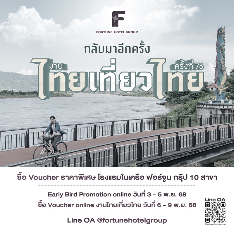 ฟอร์จูน โฮเทล กรุ๊ป (Fortune Hotel Group) ในเครือ บริษัท ซี.พี.แลนด์ จำกัด (มหาชน) ชวนเที่ยวงานมหกรรมท่องเที่ยวสุดยิ่งใหญ่ “ไทยเที่ยวไทย ครั้งที่ 76” ที่ครั้งนี้ เครือโรงแรมฟอร์จูน กรุ๊ป (Fortune Group Hotels) ขนข้อเสนอสุดพิเศษมามอบให้สายเที่ยวทั่วไทย กับ Voucher ห้องพักราคาสุดคุ้มกว่า 10 สาขาทั่วประเทศ ให้คุณเลือกพักได้อย่างอิสระ ทั้งภูเขา ทะเล แม่น้ำ และใจกลางเมือง