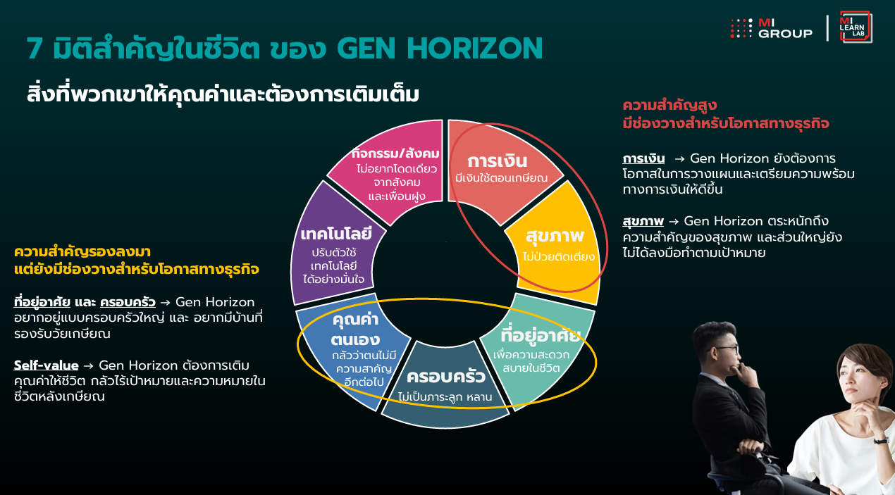 คุณพศธร สุขอัมพร New Business Development Director MI GROUP กล่าวว่าจากผลการศึกษาพบว่า Gen Horizon คือเจเนอเรชันที่อยู่กึ่งกลางระหว่างความรับผิดชอบและการเริ่มต้นใหม่ เป็นกุญแจสำคัญที่แบรนด์ควรเข้าใจ เพื่อช่วยให้คนไทยก้าวสู่วัยสูงอายุอย่างมั่นใจ มีคุณค่า และมีกำลังซื้อที่มั่นคงต่อเศรษฐกิจไทย