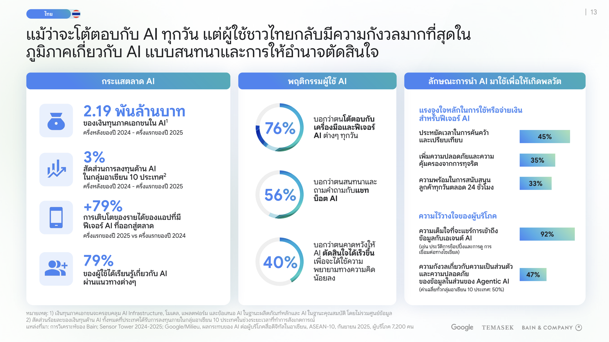 ในด้านผู้ใช้ ประเทศไทยแสดงให้เห็นถึงความพร้อมของผู้ใช้ในระดับสูง โดย 76% ของผู้ใช้ชาวไทยโต้ตอบกับเครื่องมือ AI ทุกวัน ในขณะที่ 56% ของผู้ใช้ชาวไทยสนทนากับแชทบ็อต AI