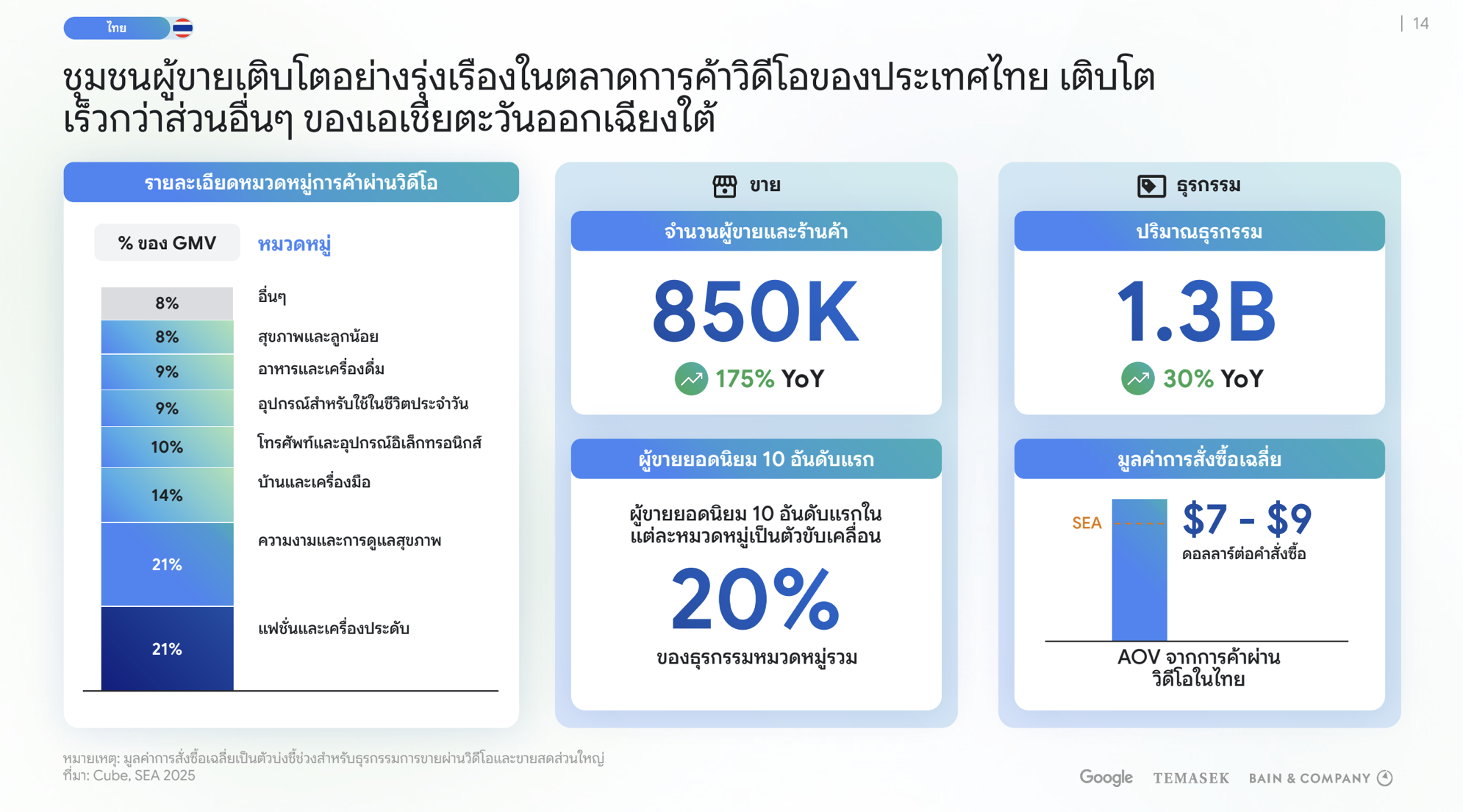 • ปัจจัยสำคัญของการเติบโตนี้คือ วิดีโอคอมเมิร์ซที่กำลังเฟื่องฟู โดยพบว่ามีผู้ขายสินค้าผ่านวิดีโอมากถึง 850,000 ราย หรือเติบโตขึ้น 175% เมื่อเทียบกับปีที่ผ่านมา ส่งผลให้ไทยเป็นตลาดที่มีจำนวนผู้ขายสินค้าผ่านวิดีโอที่ใหญ่และเติบโตเร็วที่สุดในภูมิภาคนี้