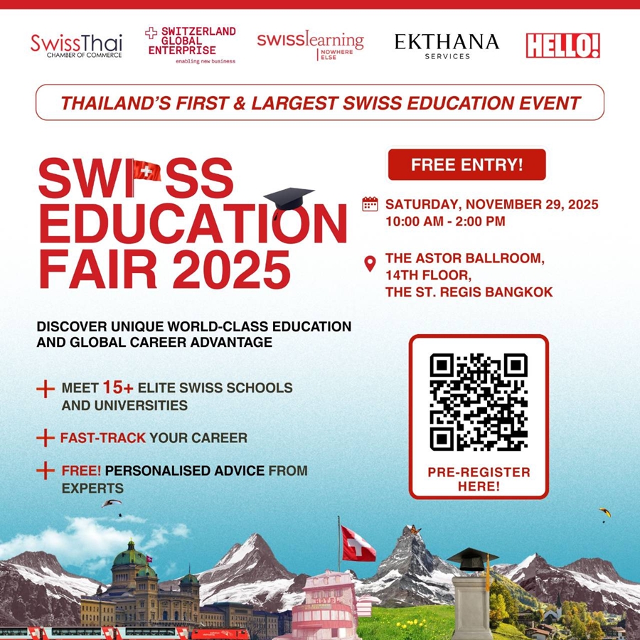 นำโดย Swiss-Thai Chamber of Commerce ร่วมกับ Switzerland Global Enterprise, Swiss Learning, Ekthana Services และนิตยสาร HELLO! ประเทศไทย เตรียมจัดงานแนะแนวการศึกษาครั้งยิ่งใหญ่ “SWISS EDUCATION FAIR 2025” รวบรวมโรงเรียนและมหาวิทยาลัยชั้นนำระดับแนวหน้าของประเทศสวิตเซอร์แลนด์มากกว่า 15 สถาบันมาไว้ในที่เดียว พร้อมกิจกรรมหลากหลาย เปิดโอกาสให้ทุกครอบครัวได้มาทำความ วันเสาร์ที่ 29 พฤศจิกายน 2568 เวลา 10.00 – 14.00 น. ณ The Astor Ballroom ชั้น 14 โรงแรม เดอะ เซนต์ รีจิส กรุงเทพ