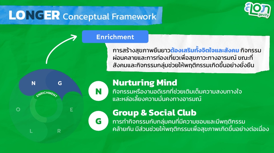G – Group & Social Glue: บทบาทของสังคมและชุมชนที่ช่วยให้ผู้คนเริ่มต้นและรักษาเป้าหมายด้านสุขภาพ เช่น กลุ่มออกกำลังกาย คลับ และกิจกรรมแบบมีส่วนร่วม