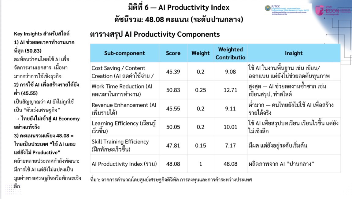 ด้านผลิตภาพจากการใช้ AI (AI Productivity) ได้คะแนน 48.08 ซึ่งอยู่ในระดับปานกลาง โดยประชาชนรับรู้ว่า AI ช่วยลดเวลาการทำงานได้มาก (50.83 คะแนน) แต่กลับช่วยเพิ่มรายได้ได้น้อยที่สุด (45.55 คะแนน) สะท้อนให้เห็นว่าคนไทยใช้ AI เพื่อความสะดวกมากกว่าการสร้างมูลค่าเชิงเศรษฐกิจ