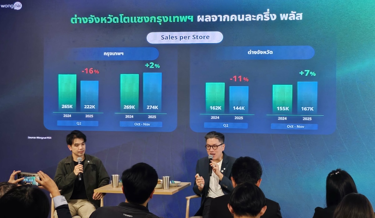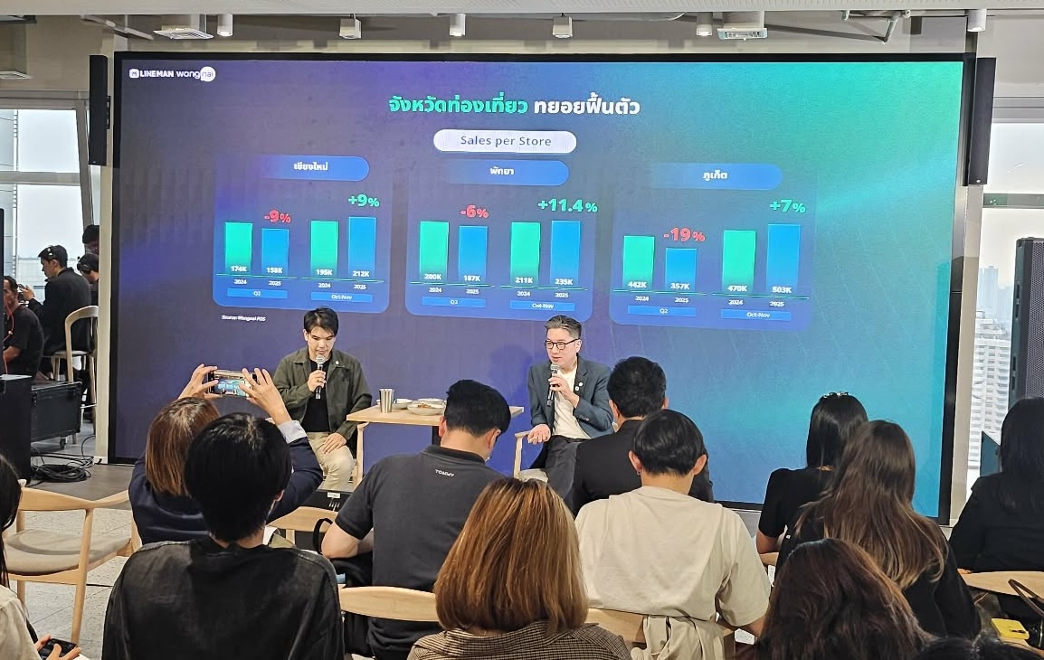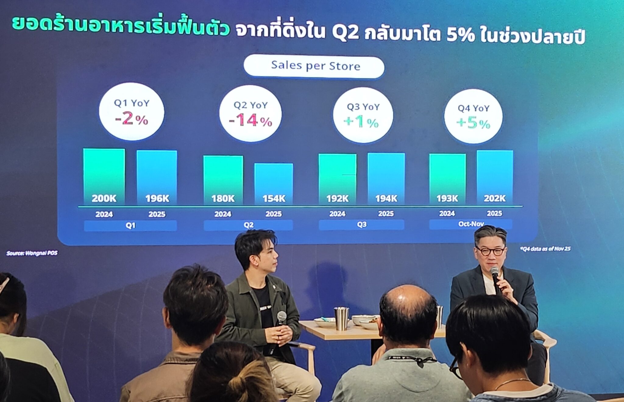 คุณยอด ชินสุภัคกุล ประธานเจ้าหน้าที่บริหาร LINE MAN Wongnai เปิดเผยว่า “ครึ่งปีแรก 2025 ถือเป็นช่วงต่ำสุดของธุรกิจร้านอาหาร โดยยอดขายต่อร้าน (sales per store) หดตัวหนักถึง -14% ใน Q2 แต่หลังจากเข้าสู่ครึ่งปีหลัง ตลาดเริ่มกลับมาเป็นบวก โดย Q3 โต +1% และ Q4 (ข้อมูลเดือนตุลาคม-พฤศจิกายน) กลับมาโต +5% สะท้อนการกลับมาของกำลังซื้อในวงกว้าง หลังแรงส่งของโครงการคนละครึ่ง พลัส”