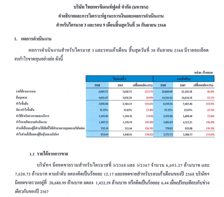อย่างไรก็ตาม TFMAMA มียอดขายลดลง 2 ไตรมาส โดยไตรมาส 2 ปี 2568 มียอดขายลดลง 7% YoY ส่วนของไตรมาส 3 ใน “คำอธิบายและวิเคราะห์ของฝ่ายจัดการ ไตรมาสที่ 3 สิ้นสุดวันที่ 30 ก.ย. 2568” ระบุว่า บริษัทฯ มียอดขายรวมสำหรับไตรมาสที่ 3/2568 และ 3/2567 จำนวน 6,693.27 ล้านบาท และ 7,620.75 ล้านบาท ตามลำดับ ลดลงคิดเป็นร้อยละ 12.17 และยอดขายสำหรับรอบเก้าเดือนของปี 2568 บริษัทฯ มียอดขายรวมอยู่ที่ 20,680.99 ล้านบาท ลดลง 1,422.59 ล้านบาท หรือคิดเป็นร้อยละ 6.44 เมื่อเปรียบเทียบกับช่วง เดียวกันของปี 2567