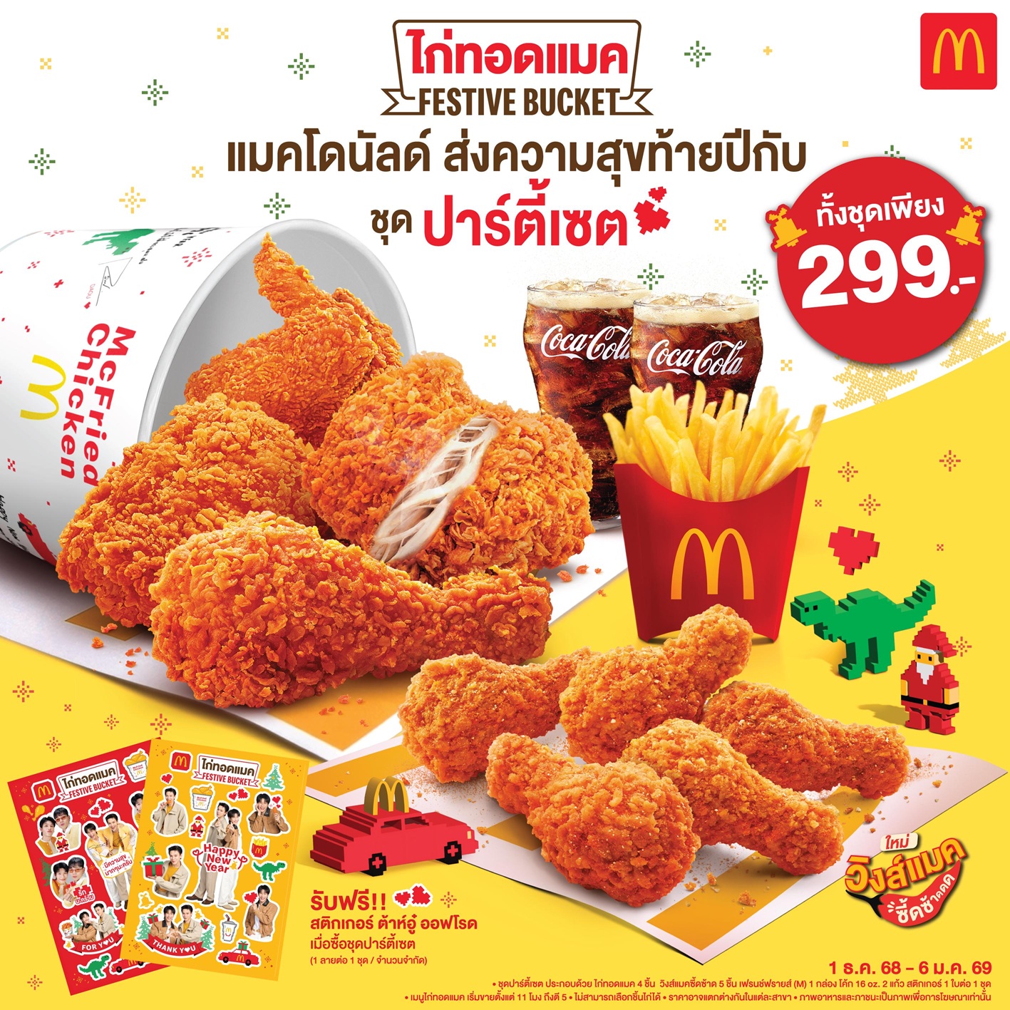- ชุดบักเก็ตปาร์ตี้ฟินเวอร์ (ราคา 399 บาท): เซ็ตใหญ่เอาใจชาวแก๊ง ประกอบด้วย ไก่ทอดแมค 5 ชิ้น, แมคนักเก็ต 10 ชิ้น, ปาร์ตี้ฟรายส์ และโค้ก 2 แก้ว