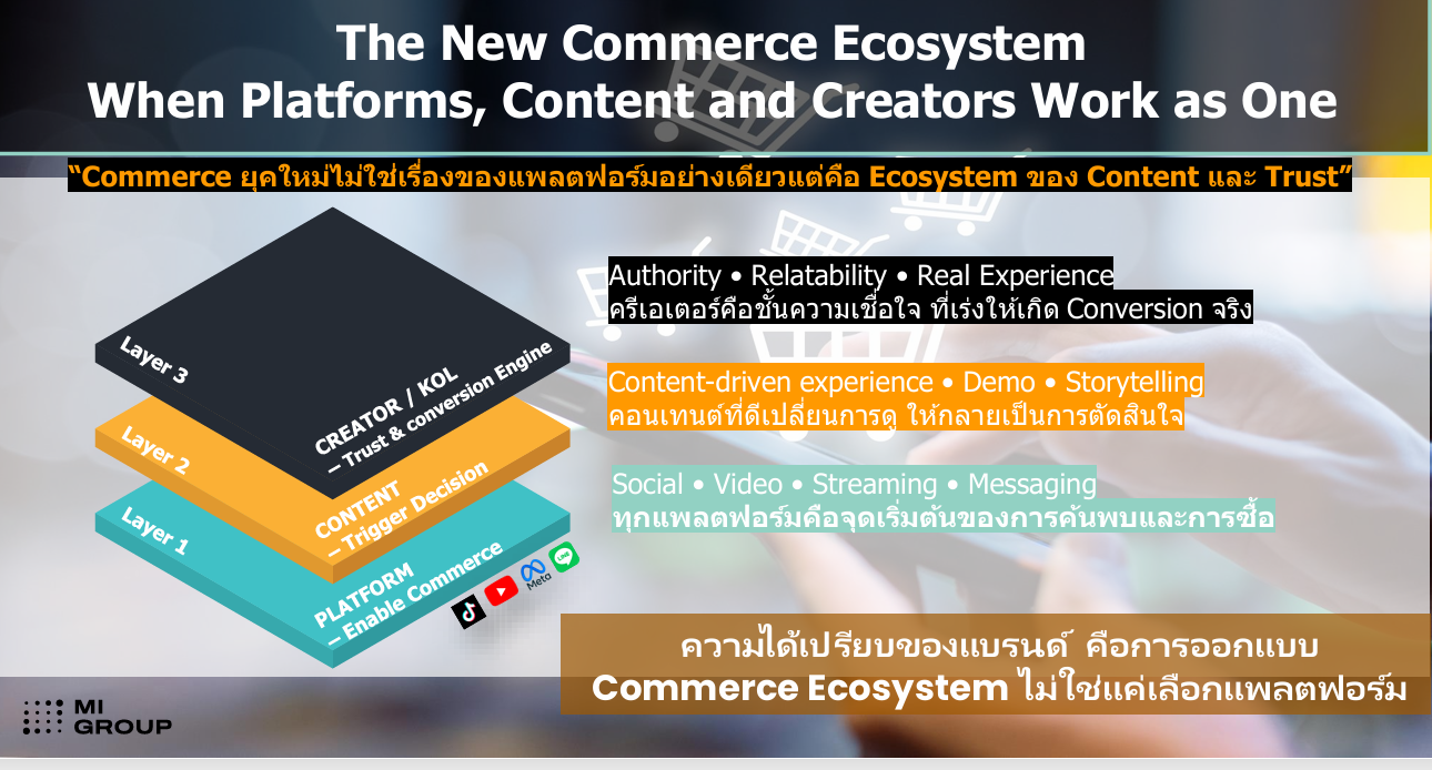 การซื้อเกิดจาก Commerce Ecosystem ที่เชื่อม Platform + Content + Creator เข้าด้วยกัน ดังนั้นแบรนด์ต้องวางกลยุทธ์ทั้งระบบไม่ใช่แยกแพลตฟอร์ม