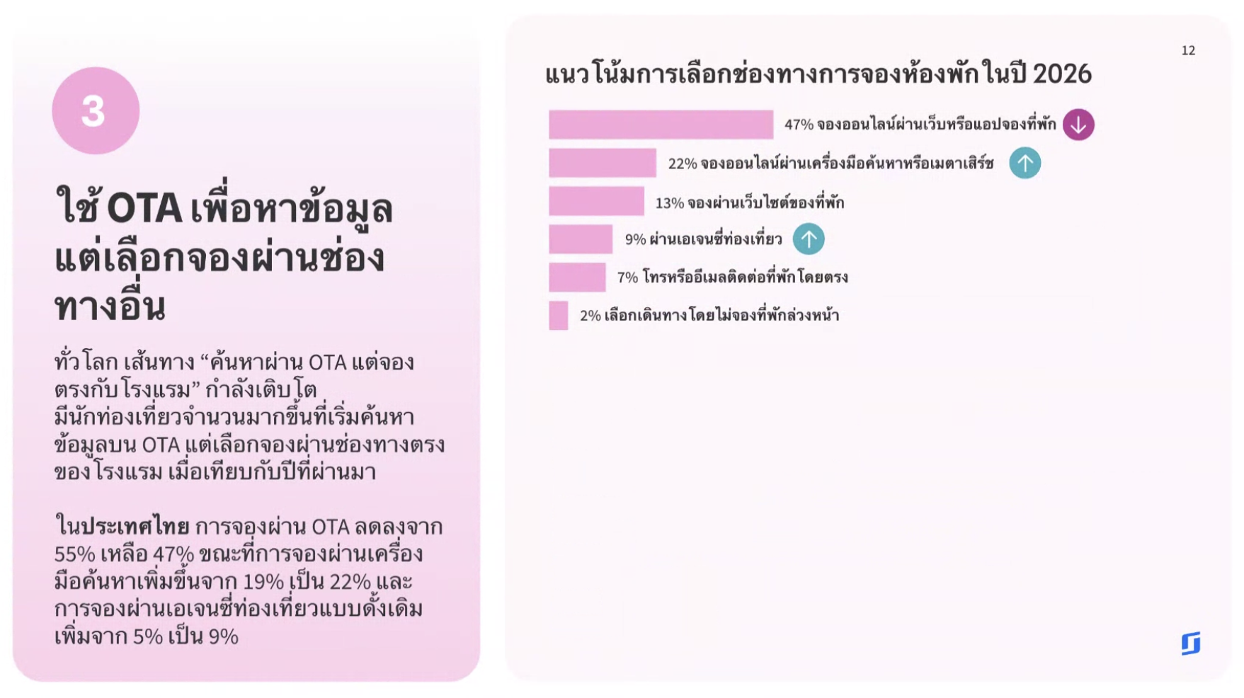 สำหรับช่องทางการจองที่พัก OTA ยังคงครองอันดับหนึ่งที่ 47% ตามด้วยเครื่องมือค้นหาที่ 22% และการจองตรงผ่านเว็บไซต์ โทรศัพท์ หรืออีเมลของโรงแรมที่ 20% ซึ่งในจุดนี้ คุณสุภกฤษฎิ์ ให้ความเห็นว่า เป็นโอกาสดีของผู้ประกอบการท่องเที่ยวที่จะเก็บข้อมูลของลูกค้าได้โดยตรง