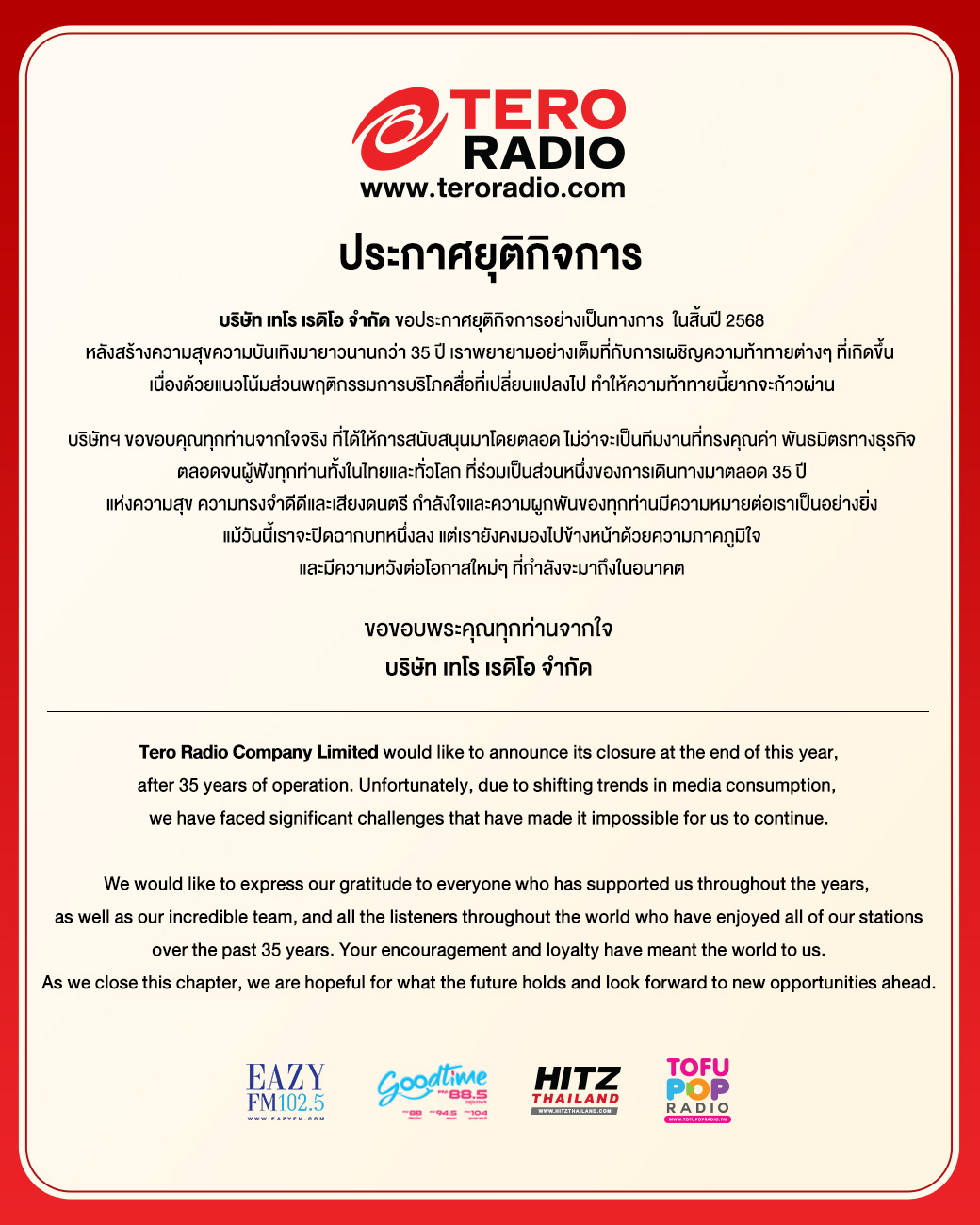 บริษัท เทโร เรดิโอ จำกัด ประกาศยุติกิจการอย่างเป็นทางการ ในสิ้นปี 2568 หลังสร้างความสุขความบันเทิงมายาวนานกว่า 35 ปี