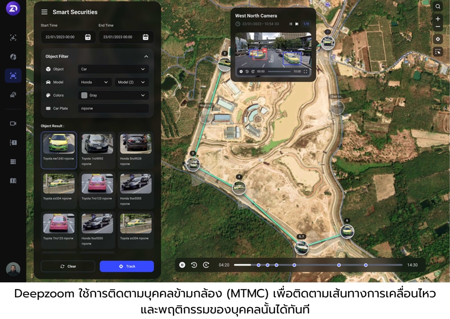 จากแนวคิดดังกล่าว Deepzoom จึงถูกออกแบบให้แตกต่างจากระบบวิเคราะห์ภาพทั่วไป ด้วยความสามารถในการเชื่อมโยงเหตุการณ์จากหลายกล้องให้เป็นทามไลน์ต่อเนื่อง ผ่านเทคโนโลยี MTMC (Multi-Target Multi-Camera Tracking) ทำให้ผู้ใช้งานสามารถค้นหาและตรวจสอบได้อย่างรวดเร็วว่าบุคคลหรือวัตถุที่สนใจ “อยู่ที่ใด เคลื่อนไหวผ่านจุดใด และทำกิจกรรมใดบ้าง” ตลอดช่วงเวลาที่ถูกบันทึกไว้ ความสามารถนี้ช่วยลดระยะเวลาการสืบค้นข้อมูลจากระดับชั่วโมงเหลือเพียงไม่กี่นาที ลดงานการตรวจสอบภาพย้อนหลังของเจ้าหน้าที่ และยกระดับกระบวนการเฝ้าระวังให้มีความแม่นยำและมีประสิทธิภาพมากยิ่งขึ้น