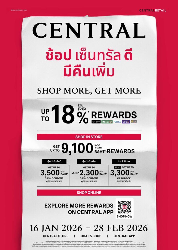 ข่าวดีรับต้นปี “ห้างเซ็นทรัล และ ห้างโรบินสัน ในเครือเซ็นทรัล รีเทล” ผู้นำธุรกิจค้าปลีกไทยเดินหน้าอัดแคมเปญไม่ยั้ง เดินหน้าสร้างความคึกคักภาพรวมรีเทล กระตุ้นนักช้อปจับจ่ายต่อเนื่อง ด้วยการประกาศจัดแคมเปญพิเศษพร้อมเชิญชวนนักช้อปวางแผนช้อบปิ้งให้ทุกบิลที่ช้อป คุ้มค่ามากยิ่งขึ้น ผ่านการออกแบบแคมเปญครั้งใหม่ที่ให้ลูกค้าเห็นความคุ้มค่าที่จับต้องได้ และสิทธิเงินคืนหลากหลายรูปแบบในแคมเปญเดียว กับแคมเปญ “ช้อป เซ็นทรัล/โรบินสัน ดี มีคืนเพิ่ม” SHOP MORE, GET MORE ระหว่างวันที่ 16 มกราคม 2569 – 28 กุมภาพันธ์ 2569