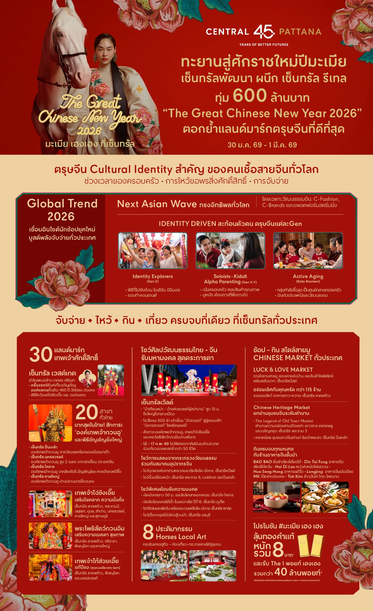 ร่วมสัมผัสพลังแห่งความมั่งคั่งและก้าวเข้าสู่ปีมะเมียมหามงคลอย่างรุ่งเรืองในแคมเปญ “The Great Chinese New Year 2026” ได้ที่ศูนย์การค้าเซ็นทรัลและร้านค้าในเครือเซ็นทรัล รีเทล ทั่วประเทศ ตั้งแต่วันที่ 30 มกราคม – 1 มีนาคม 2569