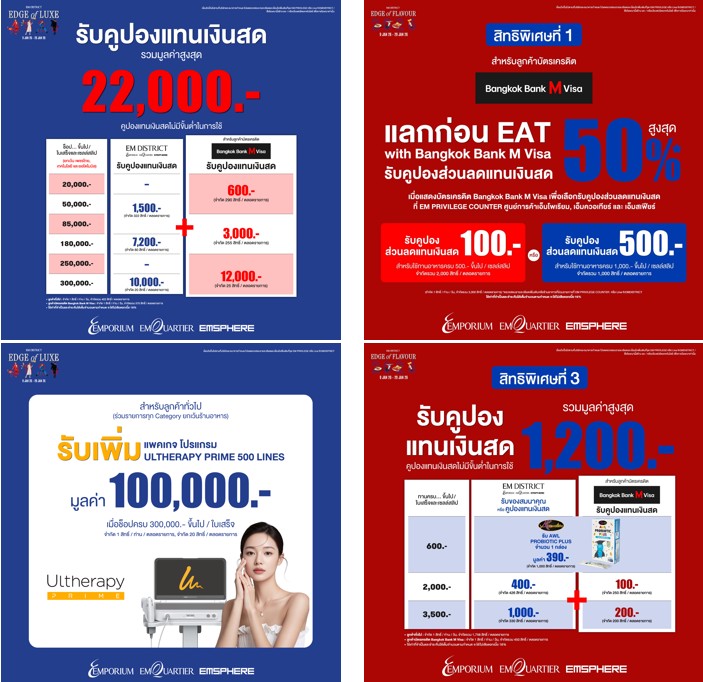 เริ่มจากความพิเศษสำหรับนักช้อปในแคมเปญ EM DISTRICT EDGE OF LUXE เมื่อช้อปปิ้งร้านค้าแฟชั่น ไลฟ์สไตล์ชั้นนำทั้ง 3 ศูนย์การค้าฯ ผ่านบัตรเครดิต Bangkok Bank M Visa ตามเงื่อนไข รับคูปองแทนเงินสดสูงสุด 22,000 บาท และลูกค้าทั่วไปเมื่อช้อปครบ 10,000 บาท รับกระเป๋าเดินทาง My Escape มูลค่าสูงสุด 4,890 บาท และพิเศษสุดเมื่อช้อปครบ 300,000 บาท รับฟรี แพคเกจโปรแกรมความงาม ULTHERAPY PRIME 500 LINES มูลค่า 100,000 บาท