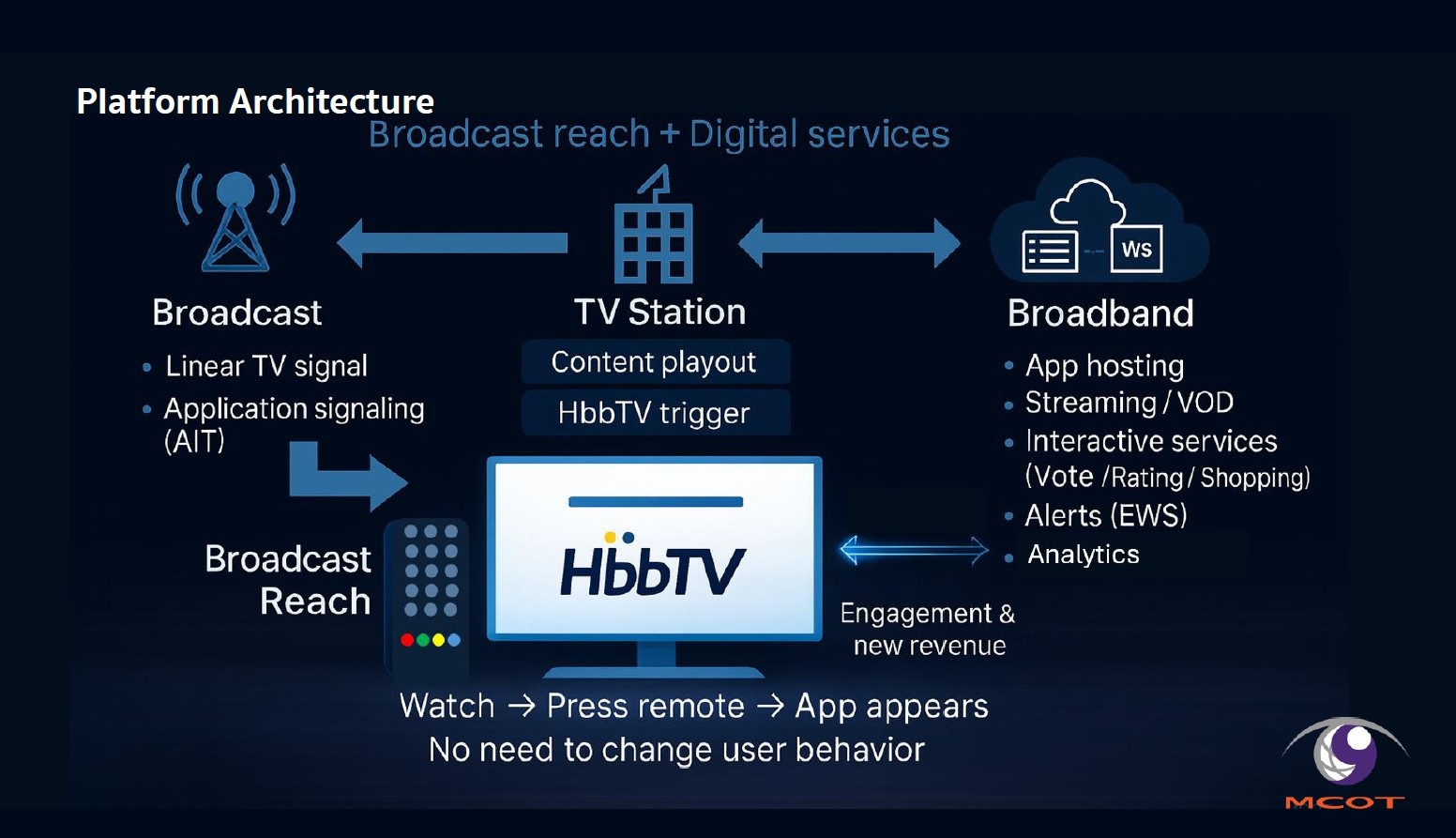 โดยในที่ประชุม อสมท ได้นำเสนอ Prototype ของเทคโนโลยี Hybrid Broadcast Broadband TV (HbbTV) เพื่อเป็นตัวอย่างในการพัฒนาเชิงบูรณาการระหว่างระบบ Broadcast และระบบ Broadband โดยสามารถเพิ่มคุณค่าการส่งมอบใหม่ อาทิ การให้บริการแบบ Interactive บริการข้อมูลและเนื้อหาเสริม (VDO on demand) บริการ E-commerce รวมถึงโอกาสในการต่อยอดเชิงบริการและธุรกิจในมาตรฐานอุตสาหกรรมทีวีดิจิทัลด้วยเทคโนโลยี HbbTV
