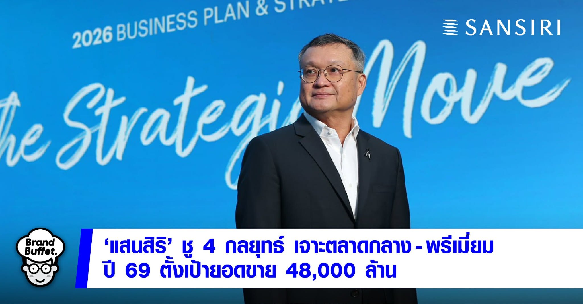 คุณอุทัย อุทัยแสงสุข กรรมการผู้จัดการใหญ่ บมจ.แสนสิริ ประกาศแผนธุรกิจปี 2569 ตั้งเป้ายอดขาย 48,000 ล้านบาท และยอดโอน 39,000 ล้านบาท ผ่านการเปิดตัว 33 โครงการใหม่ มูลค่ารวม 51,000 ล้านบาท โดยเน้นสัดส่วนกลุ่ม Premium และ Medium ถึง 80% เพื่อเจาะกลุ่มกำลังซื้อหลักในตลาดอสังหาฯ และไม่ได้รับผลกระทบจากเศรษฐกิจมากนัก