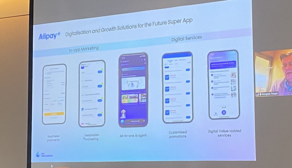 1.Alipay+ กระเป๋าเงินดิจิทัลระหว่างประเทศ โดยทำหน้าที่เชื่อมต่อร้านค้าผู้ให้บริการ Wallet, Super App รวมถึงเครือข่ายการชำระเงิน QR แห่งชาติ และบัตรเครดิต กว่า 40 ราย เข้ากับบัญชีผู้ใช้งานที่ปัจจุบันมีกว่า 1.8 พันล้านบัญชี เพื่อให้ผู้บริโภคเดินทางท่องเที่ยว และชำระค่าสินค้าข้ามพรมแดนได้ง่ายดาย โดยกลยุทธ์สำคัญคือ การวางตัวเองเป็นมากกว่าแค่บริการชำระเงิน ผ่านการพัฒนาบริการดิจิทัลต่างๆ บนแอป ไม่ว่าจะเป็น โปรโมชั่นที่เข้ากับความต้องการของแต่ละคน และบริการ AI Travel Agent ช่วยวางแผนการเดินทาง จองตั๋ว หาโปรโมชั่น และแปลภาษาให้นักเดินทางทั่วโลกได้แบบเรียลไทม์