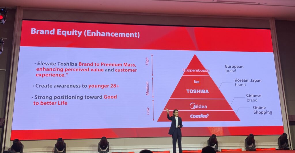 สำหรับโอกาสที่ว่าคือ อัตราการเข้าถึง (Penetration Rate) เครื่องใช้ไฟฟ้าในครัวเรือนที่ยัง “ต่ำ” ซึ่งเป็นหัวหอกสำคัญที่จะช่วยให้โตชิบาสามารถสร้างการเติบโตได้อีกมาก โดยเฉพาะแอร์ ปัจจุบันอัตราการเข้าถึงมีเพียง 30% เท่านั้น และจะเต็มร้อย แต่เธอย้ำว่ายังมีโอกาสที่ลูกค้าจะซื้อซ้ำเป็นชิ้นที่ 2 ได้ เพราะจากสถิติในจีนพบว่า ผู้บริโภคมีเครื่องใช้ไฟฟ้าในบ้านถึง 90 ชิ้น เนื่องจากเทคโนโลยีเข้ามาช้วยให้การใช้ชีวิตดีขึ้น รวมทั้งความแข็งแกร่งของแบรนด์ในพอร์ตโฟลิโอภายใต้ Midea Group ที่ครอบคลุมทุกกลุ่ม ได้แก่ Kuppersbusch สำหรับเจาะกลุ่มพรีเมียม Midea แบรนด์สำหรับตลาดแมสสู้กับสินค้าจีน Toshiba แบรนด์สำหรับเจาะตลาดกลาง-พรีเมี่ยม และ Comfee เจาะกลุ่มคนรุ่นใหม่ จึงตอบความต้องการของผู้บริโภคได้ทุกเซกเม้นต์