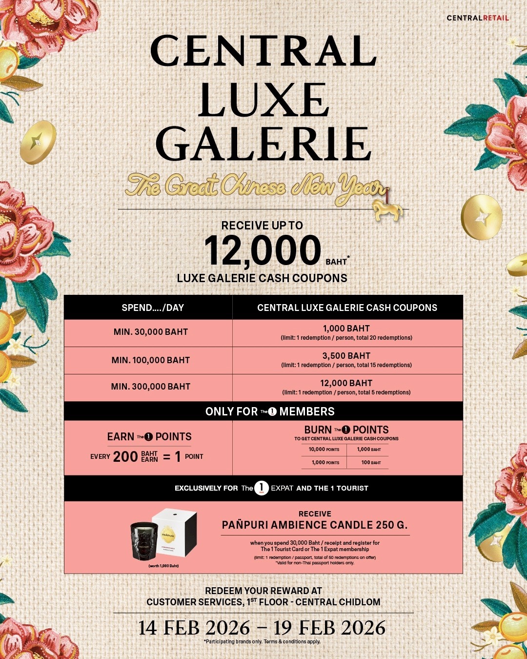 ที่ห้างเซ็นทรัลชิดลม ชวนนักท่องเที่ยวจาก ทั่วโลกมาสัมผัสเสน่ห์ตรุษจีนเสริมสิริมงคลในไทย ทั้งการเสี่ยง เซียมซียักษ์ สำหรับนักท่องเที่ยวต่างชาติเพียงช้อป ที่ห้างเซ็นทรัล ครบขั้นต่ำ 2,888 บาท รับสิทธิ์ลุ้นรางวัล 1 สิทธิ์ ชิงรางวัลใหญ่ ทองคำ 24K พร้อมของรางวัลพรีเมียมอื่น ๆ จากห้างเซ็นทรัลและพาร์ทเนอร์ อาทิ บัตรของขวัญรับประทานอาหาร เซ็ตเป็ดปักกิ่ง และอื่นๆ กว่า 25 รางวัล จาก โรงแรมเรเนซองส์ กรุงเทพฯ ราชประสงค์, บัตรของขวัญ จาก KFC จำนวน 108 รางวัล ตั้งแต่ วันที่ 6 ก.พ.–22 ก.พ. 69 และเก็บภาพเช็กอิน ซุ้มตรุษจีน ตั้งแต่วันที่ 2 ก.พ.–1 มี.ค. 69 สำหรับสมาชิก The 1 Expat เมื่อมียอดใช้จ่ายขั้นต่ำ 7,000 บาท รับคูปองเงินสด 500 บาท ณ สาขาที่ร่วมรายการ ตั้งแต่ วันที่ 30 ม.ค.–1 มี.ค. 69