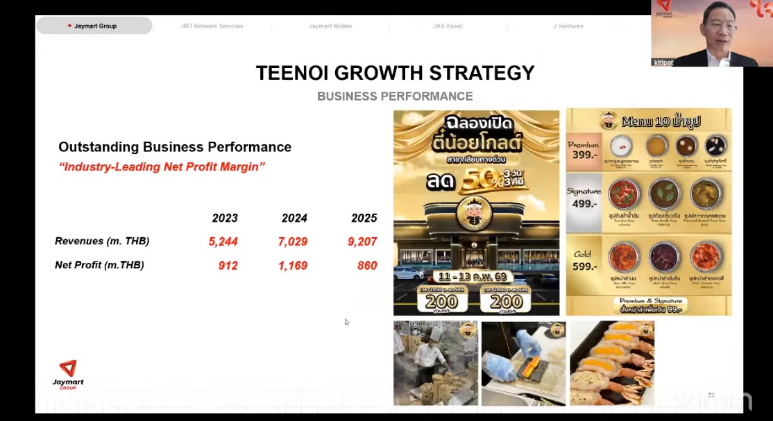 คุณอดิศักดิ์ สุขุมวิทยา ประธานเจ้าหน้าที่บริหาร บริษัท เจมาร์ท กรุ๊ป โฮลดิ้งส์ จำกัด (มหาชน) หรือ JMART กล่าวว่าแม้สุกี้ตี๋น้อย ได้รับผลกระทบจากการแข่งขันในไตรมาส 4 ปีก่อน แต่ยังเป็นบริษัทที่ทำกำไรดีในปี 2568
