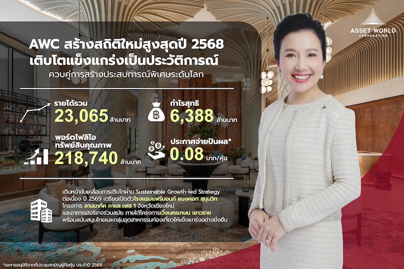 คุณวัลลภา ไตรโสรัส ประธานเจ้าหน้าที่บริหารและกรรมการผู้จัดการใหญ่ บริษัท แอสเสท เวิรด์ คอร์ป จำกัด (มหาชน) หรือ AWC เปิดเผยว่า ด้วยกลยุทธ์โมเดล AWC’s Lifestyle Destination กับการเปิดประสบการณ์พิเศษรูปแบบใหม่ และการสร้างการเติบโตอย่างต่อเนื่อง เสริมผลประกอบการสูงสุดเป็นประวัติการณ์ด้วยรายได้รวม 23,065 ล้านบาท เติบโตร้อยละ 9.8 จากปีก่อน และมีกำไรสุทธิ 6,388 ล้านบาท เติบโตร้อยละ 9.2 จากปีก่อน ขณะที่มูลค่าพอร์ตโฟลิโอทรัพย์สินคุณภาพเติบโตสู่ 218,740 ล้านบาท เพิ่มขึ้นร้อยละ 10.0