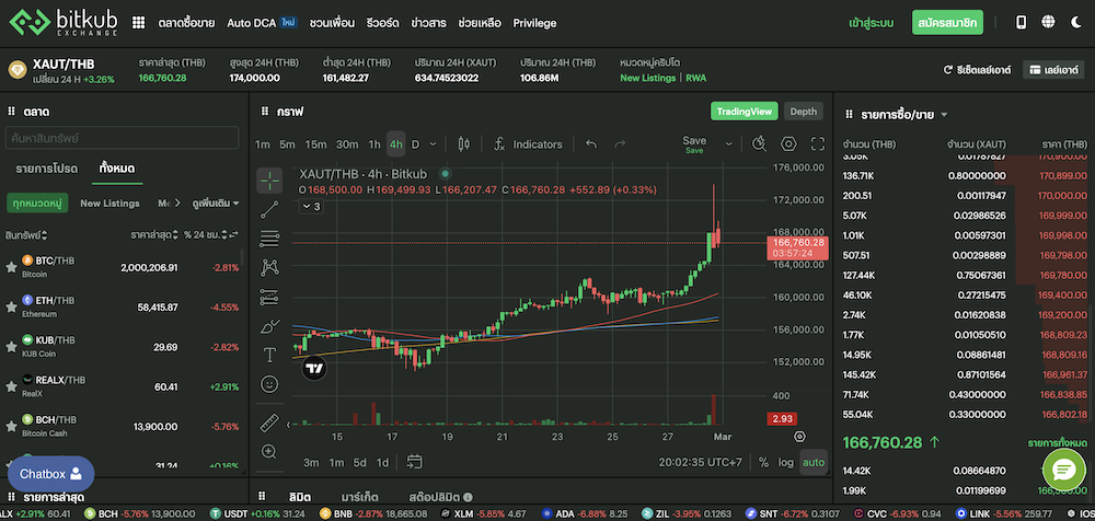 จากการตรวจสอบข้อมูลบนกระดานเทรด Bitkub Exchange ณ เวลา 20:02 น. ประจำวันที่ 28 กุมภาพันธ์ 2569 พบว่าราคาสินทรัพย์ทองคำดิจิทัลมีการเคลื่อนไหวที่น่าสนใจ โดยราคาปัจจุบันแตะ 166,760.28 บาท