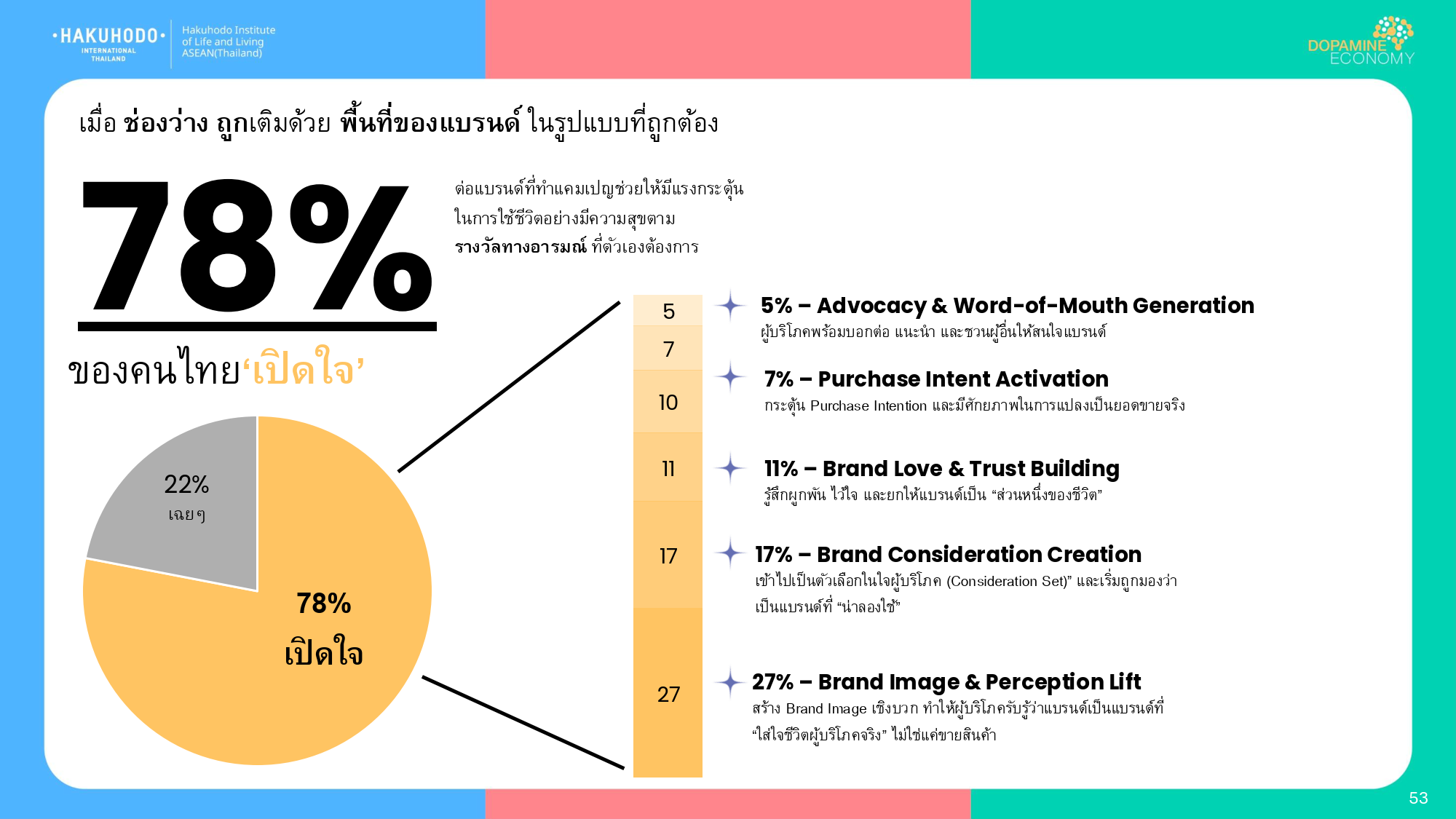 เมื่อช่องว่างถูกเติมด้วยพื้นที่ของแบรนด์ ในรูปแบบที่ถูกต้อง กว่า 78% ของคนไทยก็พร้อม “เปิดใจ” ต่อแบรนด์ที่ทำแคมเปญช่วยให้มีแรงกระตุ้น ในการใช้ชีวิตอย่างมีความสุขตามรางวัลทางอารมณ์ ที่ตัวเองต้องการ