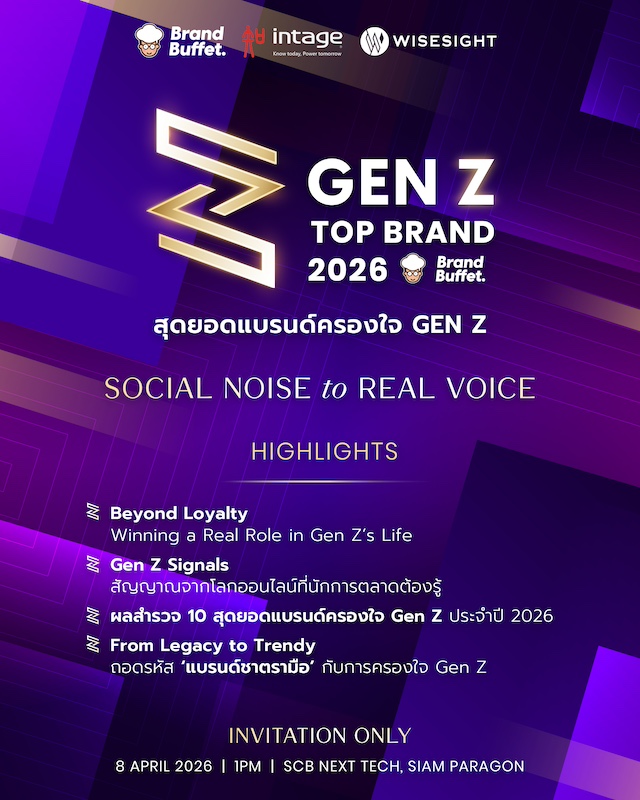 สื่อด้านธุรกิจและการตลาดของไทย ร่วมกับบริษัทวิจัยการตลาดชั้นนำ INTAGE (Thailand) และ WISESIGHT เปิดผลสำรวจ “GEN Z TOP BRAND 2026 : สุดยอดแบรนด์ครองใจ GEN Z” ในวันที่  8 เมษายน 2569 เวลา 13.00 น. ณ SCBX NEXT TECH สยามพารากอน เพื่อสะท้อนภาพการเปลี่ยนแปลงของพฤติกรรมผู้บริโภครุ่นใหม่ ที่มีความรู้สึกและตัดสินใจเลือกแบรนด์ ซึ่งมีทั้งมิติด้าน  Functional Value และ Emotional Connection เป็นองค์ประกอบ โดยในแต่ละแคทริกอรี่สินค้าก็มีปัจจัยการเลือกซื้อและชื่นชอบแตกต่างกันออกไป