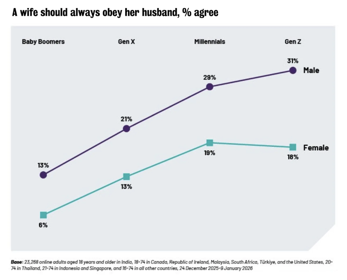 เป็นผลสำรวจที่น่าสนใจไม่น้อย เมื่อ Ipsos ร่วมกับ Global Institute for Women’s Leadership จาก King’s College London ทำการสำรวจความคิดเห็นประจำปีจากผู้คนใน 29 ประเทศทั่วโลก โดยมีผู้ตอบแบบสอบถามประมาณ 23,000 คน และพบว่า ผู้ชาย Gen Z ต้องการภรรยาที่เชื่อฟังมากถึง 1 ใน 3 แถมยังเป็นตัวเลขที่สูงกว่าผู้ชายรุ่น Baby Boomer ถึงสองเท่า