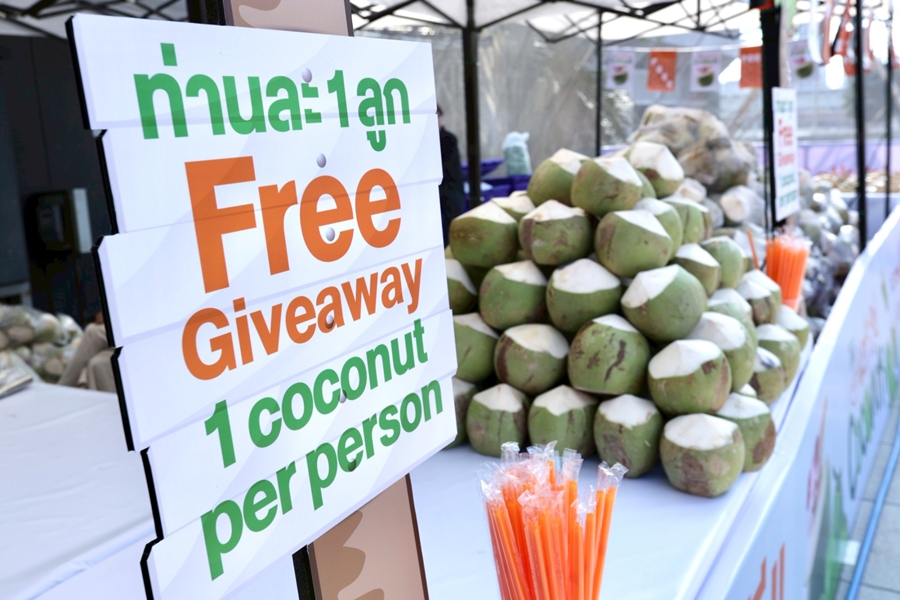 ทั้งนี้ บรรยากาศภายในงานเป็นไปอย่างคึกคัก และได้รับความสนใจอย่างมากจากประชาชนและนักท่องเที่ยวทั้งชาวไทยและชาวต่างชาติที่ทยอยเข้ามารับมะพร้าวน้ำหอมพร้อมดื่ม ซึ่งนำมาแจกฟรีในงานกว่า 10,000 ลูก พร้อมทั้งเมนูขนมและเครื่องดื่มจากมะพร้าวน้ำหอม อาทิ ขนมต้ม ขนมบ้าบิ่น ไอศกรีมกะทิ และน้ำมะพร้าวปั่น โดยมะพร้าวน้ำหอมที่นำมาจัดกิจกรรมครั้งนี้รับซื้อมาจากเกษตรกรชาวสวนมะพร้าวในอำเภอดำเนินสะดวก จังหวัดราชบุรี ที่ประสบปัญหาไม่มีผู้รับซื้อผลผลิต และส่งผลกระทบต่อการครองชีพของชาวสวนเป็นอย่างมาก