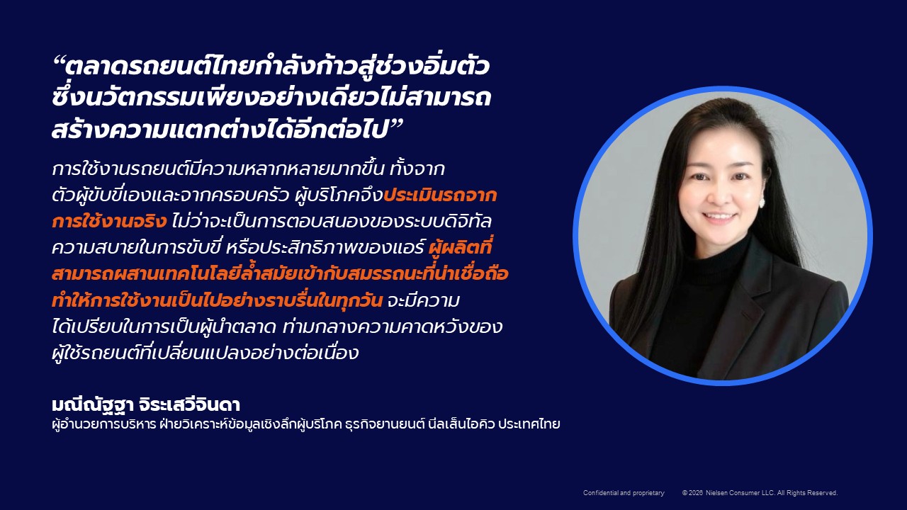 “การใช้งานรถยนต์มีความหลากหลายมากขึ้น ทั้งจากตัวผู้ขับขี่เองและจากครอบครัว ผู้บริโภคจึงประเมินรถจากการใช้งานจริง ไม่ว่าจะเป็นการตอบสนองของระบบดิจิทัล ความสบายในการขับขี่ หรือประสิทธิภาพของแอร์ ผู้ผลิตที่สามารถผสานเทคโนโลยีล้ำสมัยเข้ากับสมรรถนะที่น่าเชื่อถือ ทำให้การใช้งานเป็นไปอย่างราบรื่นในทุกวัน จะมีความได้เปรียบในการเป็นผู้นำตลาด ท่ามกลางความคาดหวังของผู้ใช้รถยนต์ที่เปลี่ยนแปลงอย่างต่อเนื่อง”